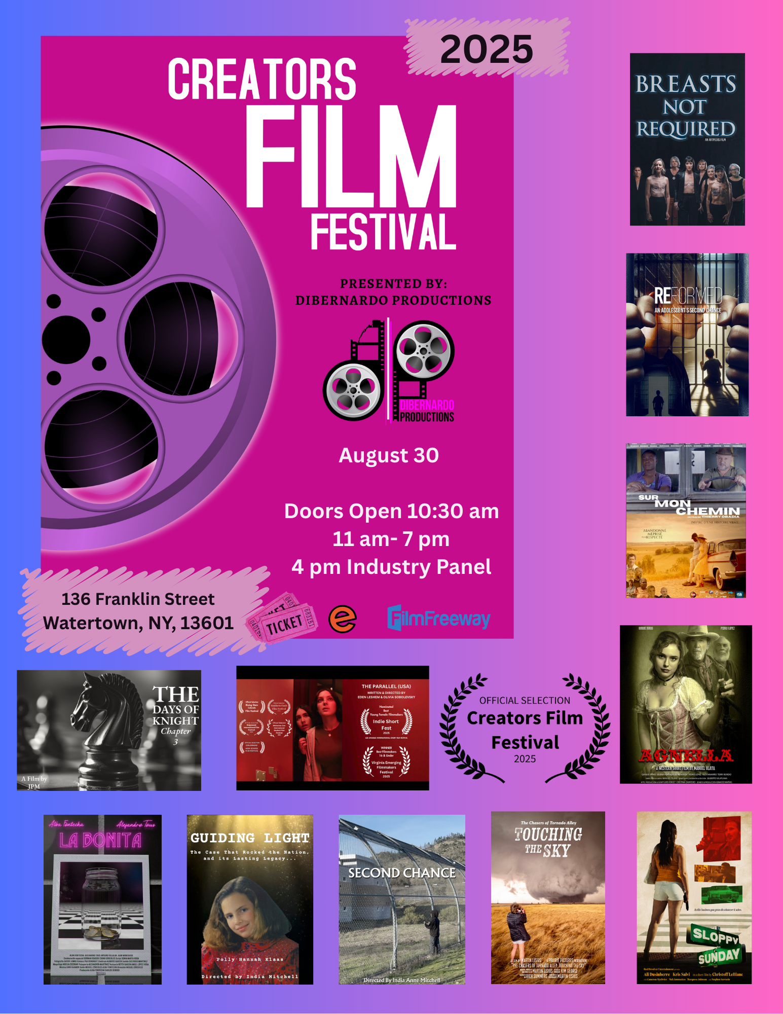 Join us for a full day of powerful storytelling, networking, and celebration of independent film at the Creators Film Festival—where visionaries, creators, and community converge at Harmonny Pac in Watertown, NY.